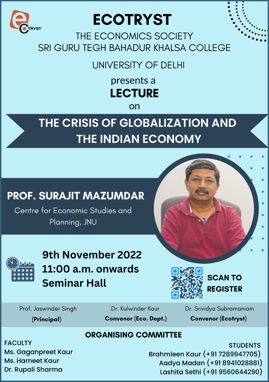 - A Seminar on “The Crisis of Globalisation and the Indian Economy” by Prof. Surajit Mazumdar was held on 9 Nov 2022.