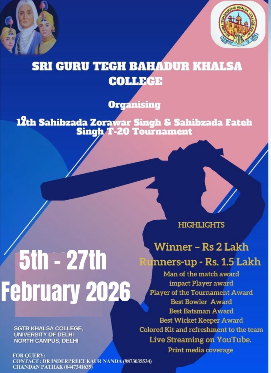 <p>The Department of Physical Education & Sports Sciences is organising its annual event in the memory of Sahibzada Zorawar Singh & Sahibzada Fateh Singh. It is the 12th Edition of T-20 Cricket Tournament scheduled from 5th to 27th February 2026.</p> <p>The tournament showcase competitive cricket performance by eminent players of State, National and International level.</p> <p>You all are cordially invited for opening ceremony of the tournament.</p> <p>Date: 05th February 2026</p> <p>Time: 11 AM</p> <p>Venue: College Cricket Grounds.</p>
