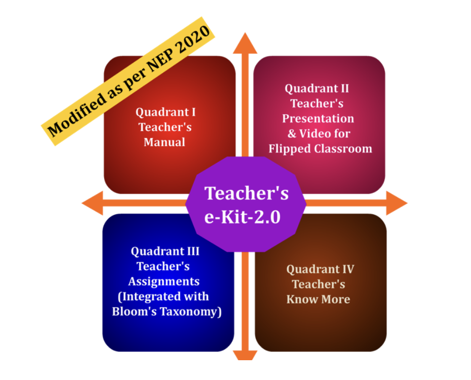 The “Teacher’s e-Kit” conceptualised by Prof. Vimal Rarh, was evolved to furthering the cause of the scheme. It contains the OER materials in the form of “e-Content in Four Quadrant Format”. It aims at providing teachers a ‘digital kit’ which eventually would facilitate Blended Learning through Flipped Classroom Model. In addition, the Kit will also familiarise teachers with the revised Bloom’s Taxonomy, which will not only help them in effective transaction of curricular provisions but also assessment of higher order cognitive operations. It is a unique blend of subject, pedagogy and ICT.